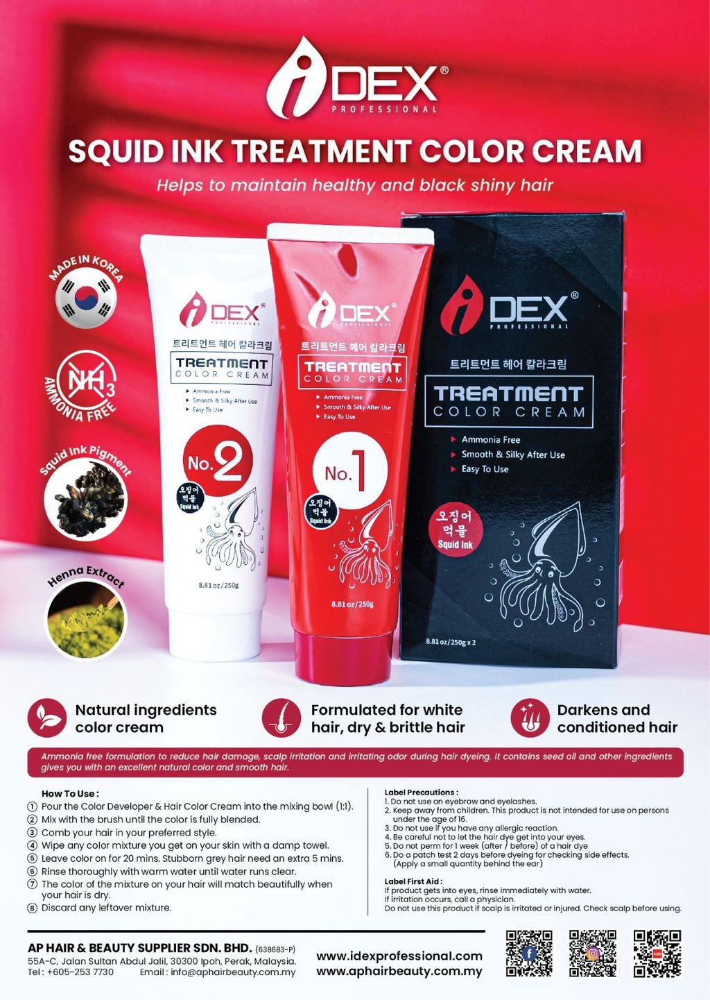 IDEX Squid Ink Treatment Color Cream is a hair dye with safety ingredient as it is less irritating than the other alkaline hair dyes, so it is suitable for those who have frequent hair loss or those with sensitive scalp. Ammonia free formulation to reduce hair damage, scalp irritation and irritating odor during hair dyeing. It contains seed oil and other ingredients gives you with an excellent natural color and smooth hair.